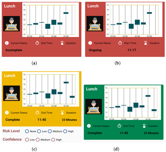 Traffic light colors have been used in various research studies, from labelling traffic colors on food to indicate their edibility or freshness [56,57], to using traffic colors as a means of self-monitoring by recording the weight and shortness of breath in a diary [58]. We use traffic color codes for the activity cards in order to make the current status of activities of the Target clear, as shown in Figure 4.