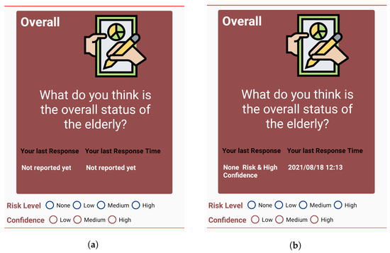 Along with the activity cards for each activity, there is a separate card called Overall card. This, in general, is to report about overall impression about the status of the elderly. This can be reported multiple times by the Monitor throughout the day, and has the same reporting option of risks and confidence as in other activity cards, as shown in Figure 4d. Thus, when submitting reports for activities, the Monitor has the option to choose what they feel is the overall status of the Target based on their judgement of activities completed or not completed. In cases of High risk situations such as no activity or long deviation, the target will not register completion of activities regularly, which means that no notifications are sent and the activity cards are not updated. If no activity has been updated for a significant time, then the monitors can deduce that there is something wrong with the target. In such situations, they can report the emergency situation using the Overall card. The card also shows the type and time of previous response for the Overall card, to make it easier for the Monitor to recall their previous impression, as shown in Figure 5b.