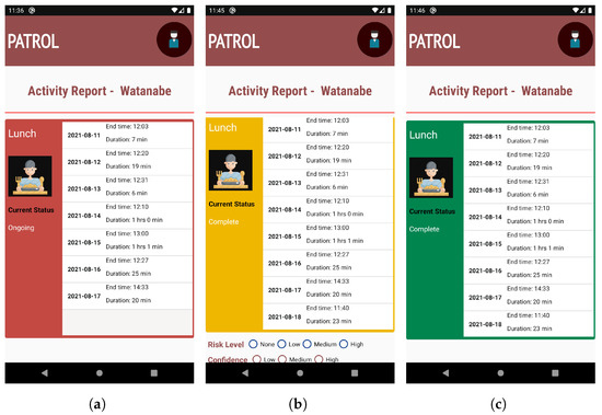 The background color of the activity card is represented by red when the target starts the activity, as shown in Figure 4b. The current status information is changed to Ongoing in this case, and the information about the start time of that activity is updated. The information about the duration of the activity is also empty at this stage.