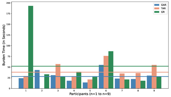 Using GAR, participants faced the lowest burden of 28 s, compared to 38 s in tabular (TAR). Similarly, none of the participants claimed that the application demanded a lot of time and effort from them. Regarding notifications, only one of the participants found them distracting, and 88.8% mentioned that they will prefer to receive activity based notifications for monitoring purposes. Similarly, all of the participants (77.8% strongly agree, 22.2% agree) responded that the use of traffic colors was useful to identify the state of the activities quickly. Therefore, we can verify RQ3, that constant notifications and using the application was not troublesome for the users.