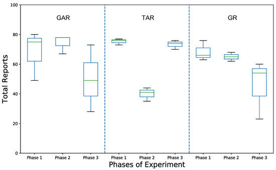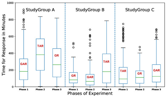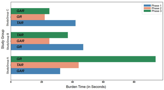 Upon further analysis, we found statistically-significant differences between activity response time for the three interfaces using a one-way ANOVA method (p = 0.005). A Tukey-HSD post-hoc test revealed a significant pairwise difference between interfaces GR and TAR (p = 0.05) whilst no difference was observed between GAR and GR (p = 0.64) or between GAR and TAR (p = 0.055).