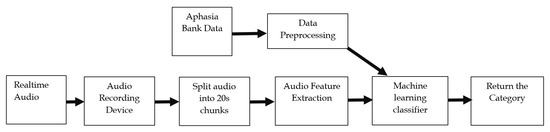 As evident from the block diagram given in Figure 1, we implement the classification model for two scenarios. The first one is for initial training and testing purposes, which uses the collected data set from Aphasia Bank that is preprocessed as specified in the following section and input to the machine learning classifier. The second scenario is a real-time voice input, which is recorded by a recording device and fed into the machine learning classifier. Even though we have implemented the system to obtain real-time inputs, we have completed all our research experiments using the first scenario, which is by using the data set collected from Aphasia Bank. Unfortunately, we could not find any aphasia patient in Sri Lanka who speaks the English language to be tested using the real-time system. However, we have included the real-time system in our software application to be used by any interested researcher/patient worldwide to make use of it.