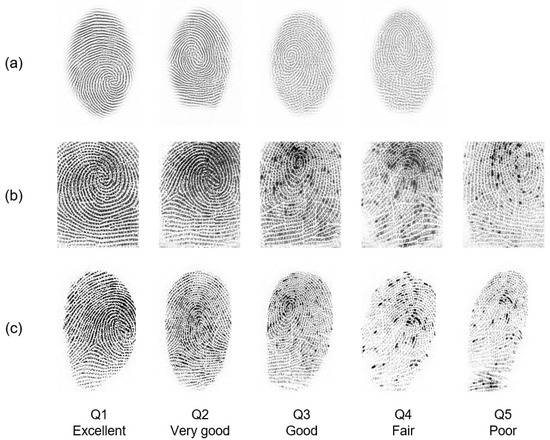 6]. It is an open-source minutiae-based quality evaluation algorithm that provides a quality value {1, 2, 3, 4, 5}, with 1 representing the best quality and 5 denoting the worst one. Each row within the set stands for fingerprints captured by the same sensor. Each column, in turn, represents the same level of quality, in which the first column is excellent while the last column is poor. It can be noticed that DB1 has no images of the poor class. In addition, most of the ridge pattern information is unclear in the impressions belonging to classes poor and fair in DB2 and DB3.