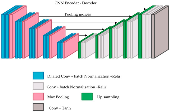 In the decoder network, each decoder up-samples its input feature map(s) by deploying the memorized max-pooling indices related to its corresponding encoder’s feature map(s). It should be noted that there is no conducted learning within the up-sampling stage. SegNet uses the max pooling indices to up-sample the feature map(s) and convolves them with a trainable decoder filter bank. Next, batch normalization is applied to each map. Subsequently, the high dimensional feature representation at the final decoder output is fed to a convolutional layer followed by a Tanh layer as shown in