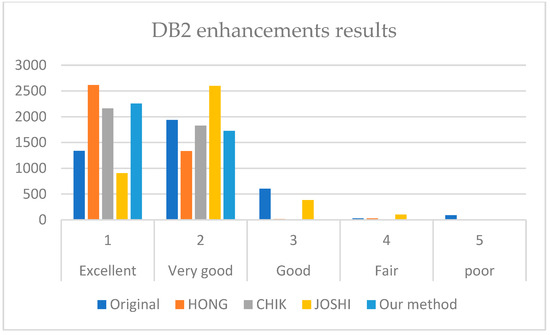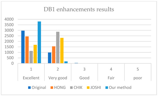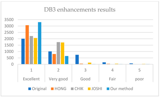 Table 4 that all images were enhanced, although different sensors were used to capture them. In DB1, there is a significant image quality enhancement, where 3796 images were enhanced out of 4000 to be in class excellent. The difference here is 204 images, which are enhanced compared to the original images.