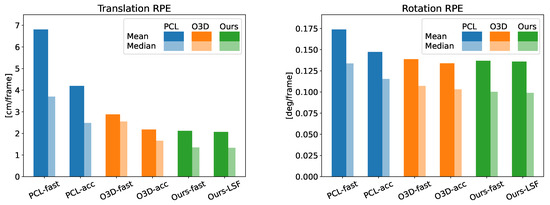 Comparison of the mean and median RPE of the different methods. Translational and rotational error are displayed on the left and right, respectively.