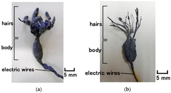 The condenser corresponds to the body of the artificial receptor, as shown in Figure 2. The hairs adhered to the body; thin silver-gilt electric wires approximately 0.1 mm in diameter, were inserted in the condenser as shown in Figure 3 and Figure A1. Here we could produce two types of hairs, conductive and non-conductive. For the former, the thin wires were simultaneously connected to the electric pole of wires for the electrode of the receptor so that those electric poles were the same at the time of electrolytic polymerization. As a result, the hairs were electrically conducted to HF rubber 4 and the electric wire for electrode of the receptor. For the non-conductive hairs, the thin wires were not connected to the electric pole of the electric wires for the receptor electrode and were neutralized at the time of electrolytic polymerization.