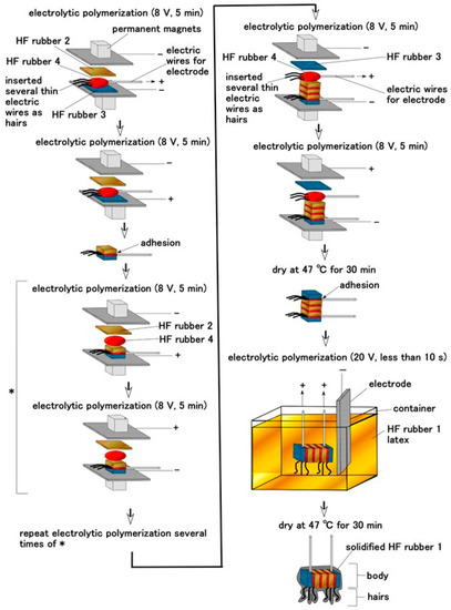 We prepared HF rubber in advance. The components of HF were as follows: 3 g water, 3 g kerosene, 3 g silicon oil (KF96 with 1 cSt viscosity, which would solidify Q; Shin-Etsu Chemical Co., Ltd., Tokyo, Japan), 21 g PVA, 3 g Fe3O4 particle (Fujifilm Wako Chemicals Co., Ltd., Osaka, Japan), 3 g Fe particles (M300, about 50 μm particles; Kyowa Pure Chemical Co., Ltd., Tokyo, Japan), and 4 g sodium hexadecyl sulfate aqueous solution. All ingredients were mixed in an agitator under air evacuation. After mixing the HF and other ingredients listed in Table 1, HF rubbers 1–4 were electrolytically polymerized. Here, the carbonyl Ni powder had particle sizes on the order of microns, with bumps on the surface. The electric conditions of electrolytic polymerization were the same as those detailed in our previous study on an HF-made artificial auditory receptor [23].