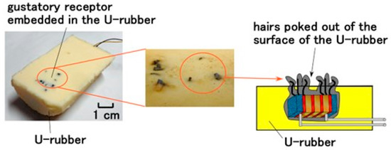 As the gustatory receptors are actually embedded in epithelial cells, the simulated receptors were embedded in a soft and elastic rubber made of U-rubber (Human skin gel, 0-solidity; Exseal Co., Ltd., Gihu, Japan) with 1.875 × 10−6 Pa−1 compressibility so that the artificial tongue could be produced as shown in Figure 4. The hairs poked out of the surface of the U-rubber.