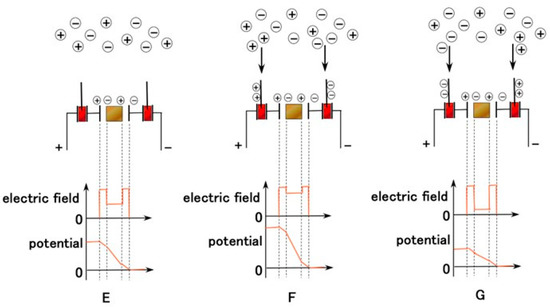 The equivalent electric circuit of the artificial receptor is shown in Figure 5 (layered type) and Figure A2 (cylindrical type). The difference between them is that of condenser shape, layered and concentric-cylindrical shaped condensers, respectively. The built-in voltage is evaluated as B in the figures. The electrical behavior of C affects the built-in voltage because the extraneous ions of other particles and molecules around the thin wires charge electrically to the thin wires, as shown in Figure 6. Contrast this to the situation in which the extraneous ions do not charge on the thin wires (E in Figure 6). The potential between the condenser ultimately increases in the case of thin-wire enhancement by inducement from the extraneous ions (F in Figure 6), and decreases in case of thin-wires diminishing by induction from the extraneous ions (G in Figure 6). The potential is evaluated by the built-in voltage. The potential is quantitatively different depending on the shape of the layered and concentric-cylindrical condensers. In addition, the vibration or motion of the thin wires in the hairs induced by extraneous movement brings about changes in the built-in voltage.