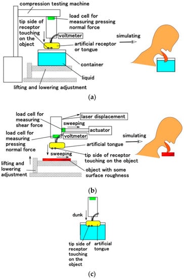 Schematic diagram of the experimental apparatus: (a) for the normal force experiment simulating dipping the tongue into a liquid for thermal and gustatory response and a rigid body for tactile response; (b) for the shear force experiment simulating licking a rigid body for tactile response; and (c) for the touching experiment of thermal and gustatory substances.