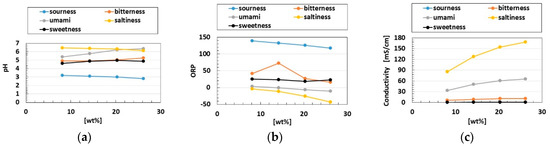 Properties of the substances used for the five tastes: (a) pH; (b) ORP; (c) conductivity, the line of sweetness taste lies on top of the one of sourness one another because of sourness’s diminutive quantitative values.