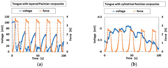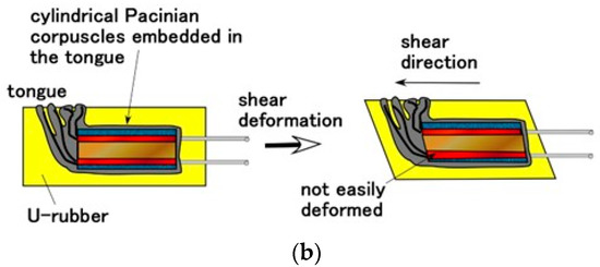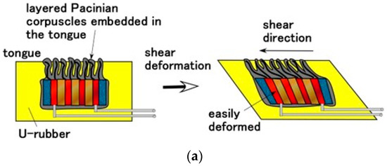 The changes in built-in voltage by the application of normal force are shown in Figure 9, and by shear force in Figure 10. The layered Pacinian corpuscles had a distinctive response to normal and shear forces compared to the cylindrical type. Regarding normal force, the number of the parts of condenser in the case of the layered type is more than that in the case of the cylindrical type, as compared between Figure 5 and Figure A2. Therefore, the sum of change in the voltage by their deformations in the case of the layered type is more than that in the case of the cylindrical type. As a result, the response to the normal force in the case of the layered type is more than that in the case of the cylindrical type. Regarding shear force, the configuration in the case of the layered type can be deformed by shear motion more easily than that in the case of the cylindrical type, as shown in Figure 11. The HF-rubber receptor embedded in U-rubber is configurated longitudinally along the tongue as shown in Figure 4 and Figure 11. The deformation of the perpendicular multi layers is larger than the axial one of the long cylinder by compression or extension. As a result, the response to the shear force in the case of the layered type is more than that in the case of the cylindrical type.