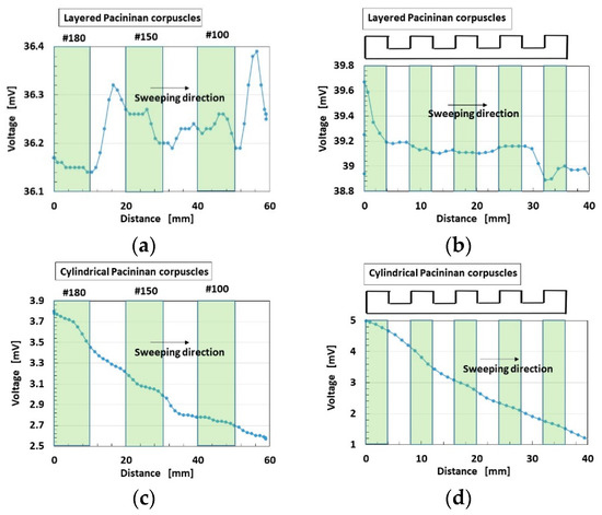 Experimental results of built-in voltage by shear force: (a,b) for layered Pacinian corpuscles; (c,d) for cylindrical Pacinian corpuscles; (a,c) on intermittently positioned sandpaper; (b,d) on a convex/concave-shaped body.