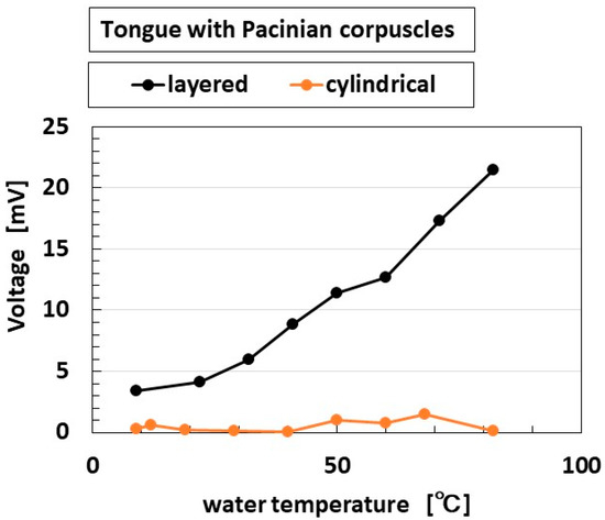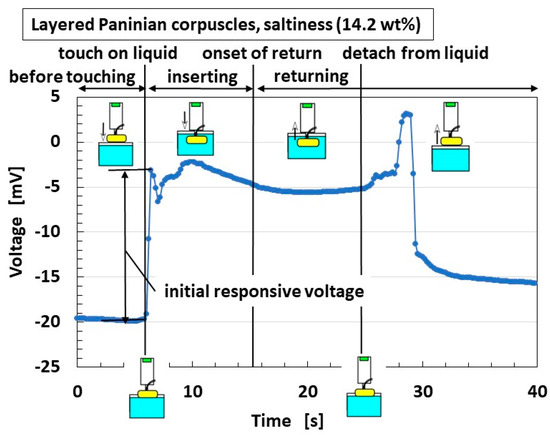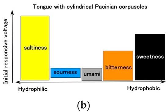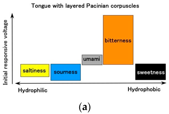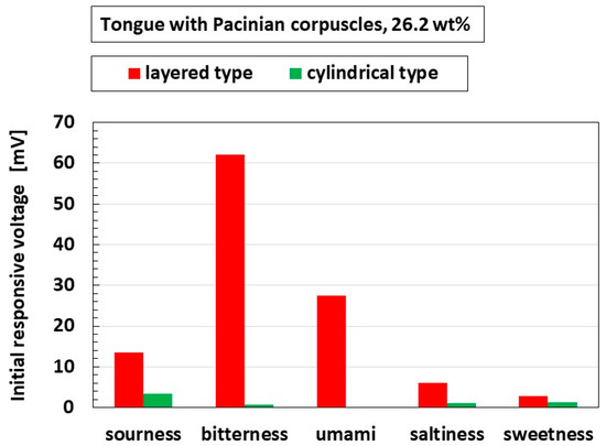 In general, for ORP, minus ORP means that the quantity of reductant [red] is larger than that of oxidizer [ox] ([ox] < [red] for ORP < 0, and vice versa [ox] > [red] for ORP > 0); [red] means that electrons are obtained, and [ox] that they are emitted. The transmitting electron produces the gustatory response. Regarding pH, pH > 7 indicates that the quantity of ionized hydrogen [H+] is lower than that of the hydroxide ion [OH−] ([H+] < [OH−] for pH > 7, and vice versa [H+] > [OH−] for pH < 7). For example, the umami-liquid has more [OH−] and the sweetness-liquid more [H+]. Thus, according to the relations of [ox] and [red], [OH−] and [H+], respectively, the gustatory response changes. These ions affect the receptor such that the built-in voltage changes by the five tastes (Figure 6). Based on these electrochemical characteristics, the response of the present Pacinian corpuscles varied with the five tastes, as shown Figure 15. The gustatory response differed between the layered and cylindrical configurations.