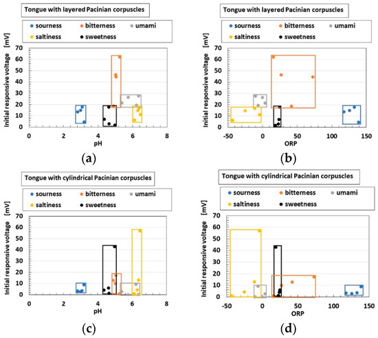 Experimental results of initial response voltage to five tastes: (a,b) for layered Pacinian corpuscles; (c,d) for cylindrical Pacinian corpuscles; (a,c) by pH; (b,d) by ORP.