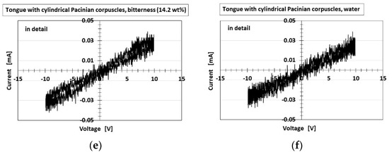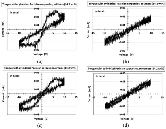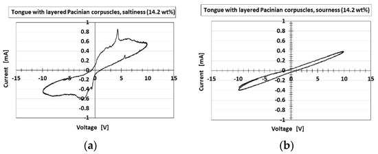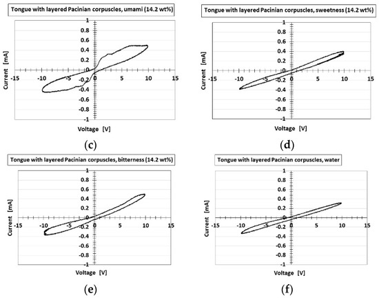 Figure 17 and Figure 18 present the I–V characteristics for the layered and cylindrical types, respectively, as well as a comparison to water. The cyclic form differed with the five tastes, allowing the artificial tongue to discriminate between them. Saltiness had the largest cyclic area, followed by umami. Sourness, sweetness, and bitterness had a smaller cyclic area than saltiness and umami. Sourness and bitterness had a slightly larger area at minus V than at plus V, while the cyclic area of sweetness was the same at plus V and minus V. The cyclic area of bitterness at plus V was slightly larger than that of sourness. This quantitative order of the cyclic area was similar to that of pH, for which the response was in the following order: saltiness, umami, bitterness, sweetness, sourness, as shown in Figure 8. This was because higher [OH−] (i.e., less [H+]) or lower ORP (i.e., more [red] than [ox]) created a larger cyclic area. These results are the characteristic findings of the HF-rubber made gustatory receptor embedded in the artificial tongue showing that the cyclic form is different by five tastes.