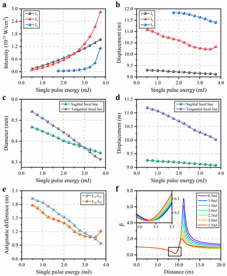 where and is the center of gravity. The astigmatic parameter is defined as the ratio of the beam width in the x and y directions. While the value of is further away from 1, the shape of the spot tends to be more elliptical, i.e., the distortion of the beam is more serious. Figure 3f illustrates the variation of the astigmatic parameter along the propagation axis at different energies. The positions of the extreme values correspond to the sagittal and tangential focal lines. By increasing the input energy, the central energy in the cross-section of the beam becomes more concentrated due to the inhomogeneity of the intensity distribution. Thus, the beam widths at the focal points decrease and the symmetry of the beam becomes better as the foci move forward, which indicates that the nonlinear effect can reduce the astigmatism.