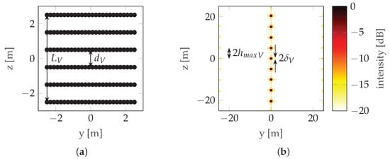 CSAR/MBSAR example: (a) Trajectory. (b) PSF. is the vertical synthetic aperture size (the distance between the highest and lowest pass) and is the vertical sampling distance (the distance between consecutive passes).