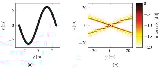 Another solution is the use of non-rectilinear trajectories. The literature available on that topic is scarce; however, two sources provide a decent basis for further development. The research presented in [11] focuses on bistatic three-dimensional (3D) Synthetic Aperture Radar (SAR) imaging and a UAV is considered as a RAdio Detection And Ranging (radar) carrier. In [11], both parametric and nonparametric imaging are considered, and trajectory non-rectilinearity is introduced by adding curvature. This approach is an important step to establish the relationship between the three-dimensional (3D) image quality and the receiver flight path. Another study [12] focuses on a sinusoidal trajectory (see Figure 5) and presents numerous simulation results of imaging simple scenes with isotropic reflecting points for trajectories that are a single period of a sinusoidal function, a segment of a circle, and a combination (sum) of sinusoidal and circular trajectories. Although the article often emphasizes the strong dependence of the characteristics on the aspect angle, the simulations were carried out only for isotropic points. The problem of the possibility of implementing a given trajectory with a radar carrier was raised, but the only conclusion presented was the need to minimize the height gradient, indicating that a fixed-wing aircraft was probably considered a radar carrier.