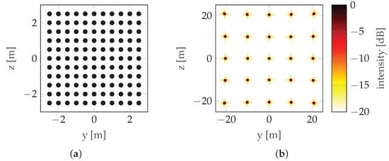 Evident grating lobes can be seen. If uniform sampling is replaced by random sampling (Figure 7), the grating lobes become smeared. In general, a sufficiently densely sampled aperture of dimension by provides by resolution when: