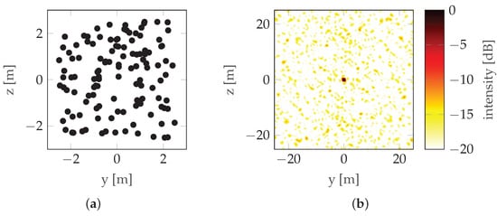 In this case, the distance between passes () is not equal to the vertical length of the synthetic aperture (). An example of PSF is presented in Figure 4.