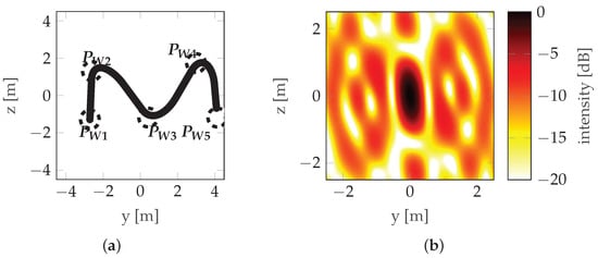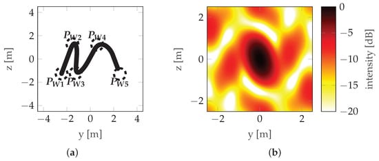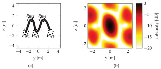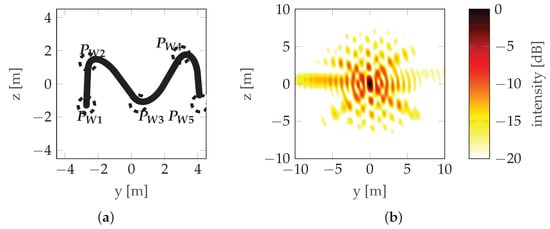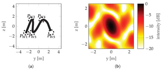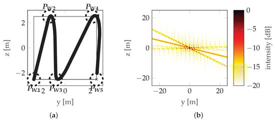 From a practical point of view, it is important that the trajectory is defined unambiguously by a minimum number of parameters, as the number of parameters determines the number of dimensions of the function to be optimized. If the motion model of the radar platform is known, and the influence of atmospheric conditions (wind) on the actual trajectory can be neglected, the trajectory is unambiguously determined by the location of waypoints. Waypoints are the navigation points used by the radar platforms’ autopilot to create the trajectory. Waypoints are visited by the platform in predefined order and a waypoint is considered visited when the distance between the platform and the waypoint is lower than specified acceptance radius. In this paper, the number of waypoints is indicated by N and they are distributed along the horizontal dimension of the aperture plane, placed alternately on the lower and upper sides of it, visited by the platform according to a zigzag pattern (see Figure 8), where the positions of the initial () and final () points are given by:
