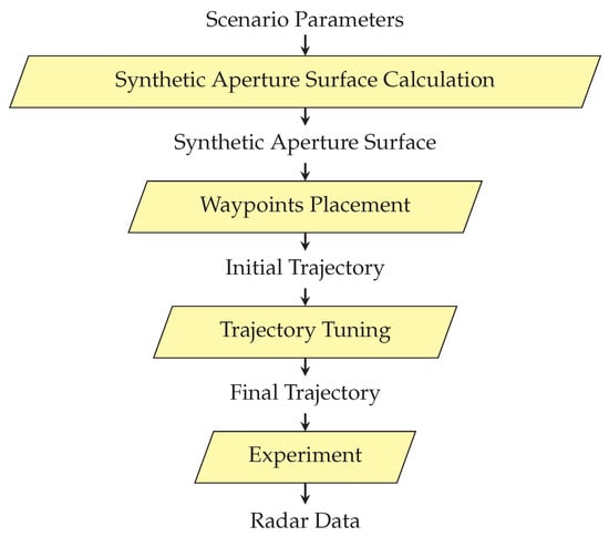 The algorithm starts with the determination of the synthetic aperture surface, and then the waypoints are placed on it through which the trajectory is carried out according to the motion model of the platform. The final step is optimization to improve the quality parameters and reduce the flight time. The subsequent stages are described in the following subsections.