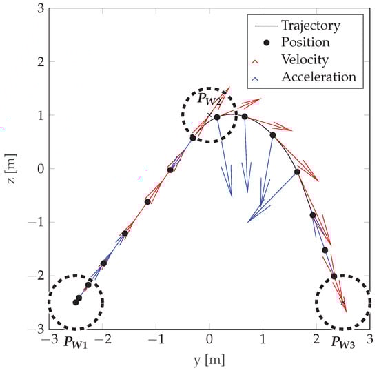 Both approaches mentioned above do not fully exploit the potential of a multirotor that can fly along trajectories much more complex than a curved line [13]. What is more, the practical application of such trajectories can be difficult, because they are determined without taking into account the platform motion model. In the case of fixed wings, following the curve accurately requires solving a series of equations, while in the case of multirotors, it requires determining many waypoints.