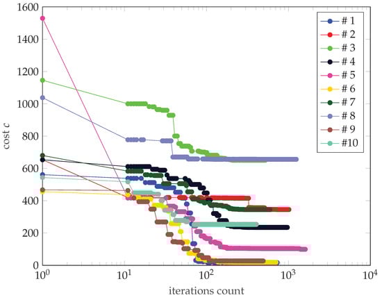 The algorithm stops on two conditions: The iteration limit has been reached, or both the simplex size and the difference between the function values are below certain thresholds: and , where is the argument step threshold and is the function step threshold. The values used in this experiment are as follows: the iteration limit is 3000, , , , , .