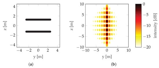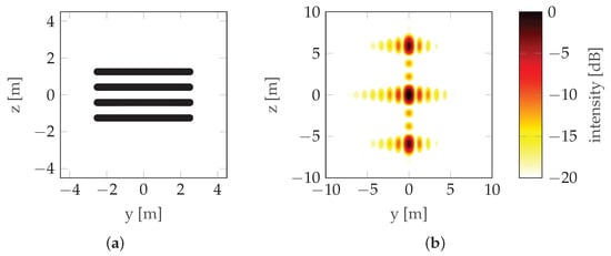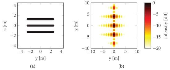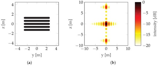 It can be seen that increasing the vertical length of the synthetic aperture () by adding more baselines increases the resolution without increasing the height ambiguity—the distance between the repeated lobes is the same in Figure 2 and Figure 4 (in the first case, —see (3) and (4)), but the size of the lobe is smaller in the second case. The main drawback of these particular methods is the unnecessarily long scanning time and the large amount of data.