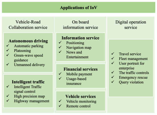 As the fourth industrial revolution, industry 4.0 has started an important development stage and academia, industry and management departments are making efforts to realize the intelligent ecology of industry 4.0 [1,2]. As a necessary foundation of industry 4.0 and key use cases such as smart city and smart industry, Internet of Things (IoT) realizes the intelligent perception, recognition and management of objects and processes through the connection between things and things, and people and things. In recent years, Intelligent Transportation System (ITS) and Intelligent Vehicles (IV) are the research hotspots of many researchers and technology companies. As the most important application fields of the IoT, IoV is an essential key technology for the next generation of ITS, and also one of the most important breakthroughs. The realization of IoV can significantly improve the smart city and the sustainable development of energy. For example, the traffic management system in the environment of IoV and vehicles with autonomous driving function can reduce traffic congestion, traffic accidents, and environmental pollution. Vehicles under the networking of an intelligent vehicle system can provide users with more comprehensive and personalized mobile travel service, such as path planning, service recommendation, and intelligent parking to provide a safe, comfortable, intelligent, and efficient driving experience and transportation services, improving the efficiency of transportation. At the same time, they promote an intelligent level of transportation service for society. Applications of IoV are listed in Figure 1. IoV is not only applied to urban traffic, but also has many applications; for instance, internet of underwater vehicles and internet of aerial vehicles. Drones are used in intelligent logistics, oil and gas equipment inspection, environmental and traffic monitoring, disaster recovery and more scenarios. IoV has attracted a large number of researchers and companies due to its great research value and commercial interests.