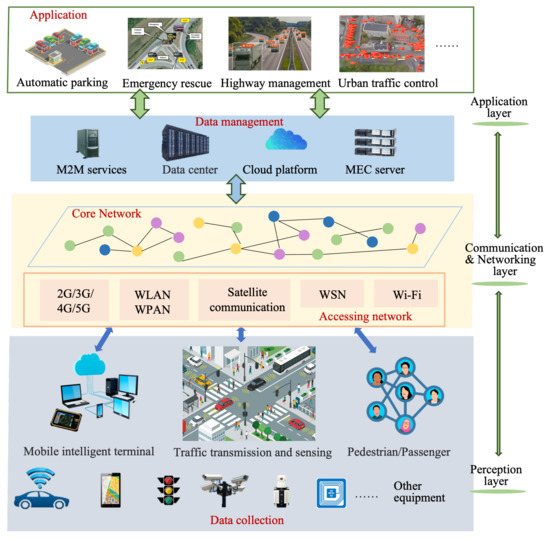 The perception layer is the foundation of IoV and contains all sensors inside and outside the vehicle, which collect environmental data and detect specific events of interest; for instance, vehicle condition, road conditions, traffic lights, and environmental conditions. The goal is to obtain the knowledge of the whole environment by collecting information from multiple angles [28]. After screening, integration, and analysis, these large amounts of collected information can afford data support for the realization of various businesses in the IoV.