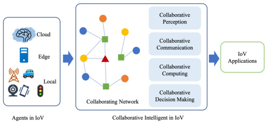 Many articles have reviewed and surveyed research issues from various perspectives in IoV, including 5G technology evolution [6], edge service optimization [7], attacks and detection mechanisms [8], secure and trust management [9,10,11], and big data extraction and decomposition [12]. There are also articles proposing new generic IoV architectures [13,14], applied Software-Defined Networking (SDN) on VANET [15], or studying the deployment and application of IoV in a smart city [16]. In addition, there are many works on the application of new techniques in IoV; for instance, Deep Reinforcement Learning technologies [17], Blockchain [18], Digital Twins, and Federated Learning [19]. These articles well introduce the basic technology, network architecture, and typical applications of IoV, but rarely involve the problem of collaborative intelligence in IoV. There are still a small number of articles discussing the problem of collaborative intelligence in IoV, including collaboration in smart drones and IoT [20], cooperation and collision avoidance in UAVs [21], and sociality of collaborative CAVs [3], but they are limited to specific fields or research problems, and cannot describe the whole picture of the collaborative problem involved in the heterogeneous network of IoV. In addition, the articles on CI are not limited to IoV [22,23], which is a good reference for the study of CI in IoV scenarios, but more targeted work is desired to discuss CI problems according to the characteristics of fast-moving vehicles and high delay requirements of IoV applications.