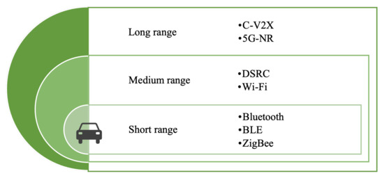 - From the perspective of communicating rangeCommunication in IoV can be classified as short-range, medium-range, and long-range communication [34], as shown in Figure 5. Short-range communication technology can be used for in-vehicle device connection or V2P scenarios, including Bluetooth, UWB, ZigBee, etc. At present, Wireless Local Area Network (WLAN) and DSRC are able to provide wireless communication within approximately 300 meters for IoV, which can be used in V2V and V2I scenarios and classified as medium-range communication. Cellular Communication technology enables vehicles to communicate with objects thousands of meters away. Nowadays, there is no one communication method that can meet all the communication needs of IoV. Therefore, how to select and formulate a scheme to ensure the CI between vehicle and vehicle, and vehicle and environment, is a key concern when the above multiple access methods coexist.