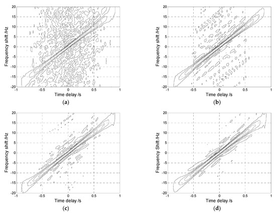 It is observed that AF fails to reflect the energy distribution of due to the influence of impulsive noise. However, in Figure 1b–d, the signal energy is mainly concentrated along the straight line , which means that the FLOAF, CRAF, and FLOCRAF can reflect the energy distribution of . In particular, CRAF and FLOCRAF have a better energy concentration performance than FLOAF, and FLOCRAF has the best energy concentration ability.