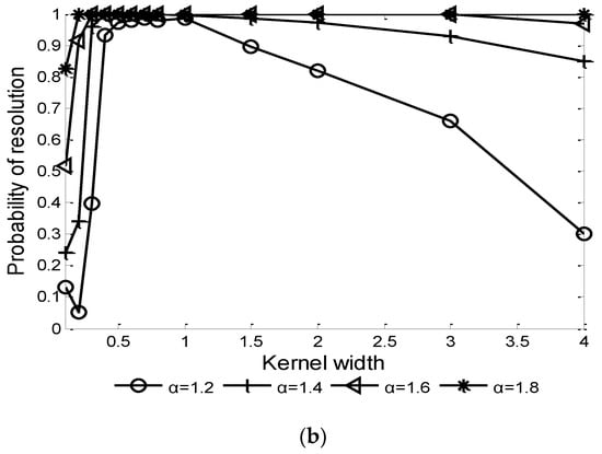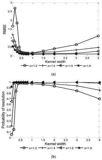 For the correntropy kernel function-based algorithms, the kernel width is an important factor affecting the performance. Given and characteristic exponent , the influence of kernel width on the performances of CRAF-ESPRIT and FLOCRAF-ESPRIT algorithms are shown in Figure 2 and Figure 3, respectively.