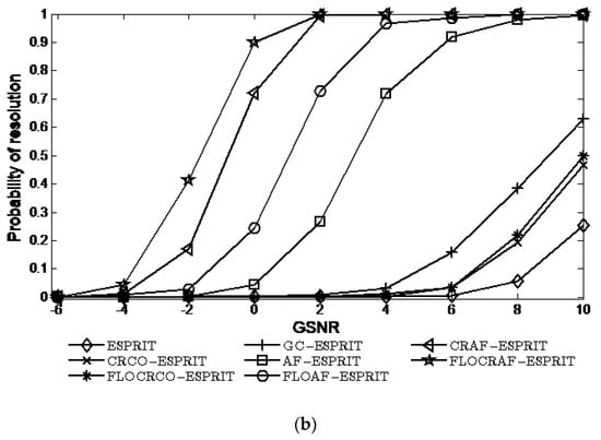It can be seen that when the number of snapshots is bigger than 600, the probabilities of resolution of CRAF-ESPRIT and FLOCRAF-ESPRIT algorithms can reach 100%. However, even though when the number of snapshots is 2000, the probabilities of resolution of FLOAF-ESPRIT and AF-ESPRIT algorithms are only 98% and 86%, while the probabilities of resolution of the ESPRIT, CRCO-ESPRIT, FLOCRCO-ESPRIT, and GC-ESPRIT algorithms are less than 20%.