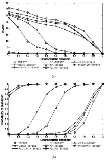 Performance vs. characteristic exponent ): (a) RMSE; (b) Probability of resolution.