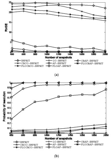 In this experiment fixed and , the simulation results in Figure 6 illustrate the performance of the ESPRIT, CRCO-ESPRIT, FLOCRCO-ESPRIT, GC-ESPRIT, AF-ESPRIT, FLOAF-ESPRIT, CRAF-ESPRIT, and FLOCRAF-ESPRIT algorithms under a wide range number of snapshots changes from 400 to 2000.