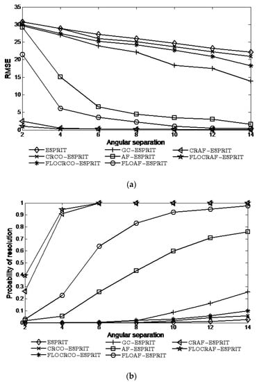 Performance vs. angular separation: (a) RMSE; (b) Probability of resolution.