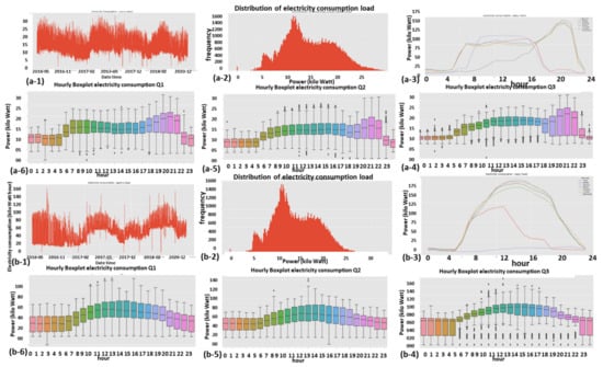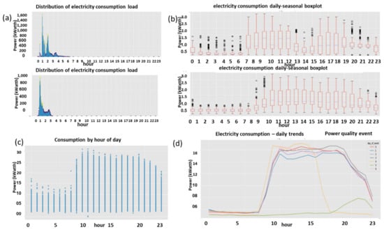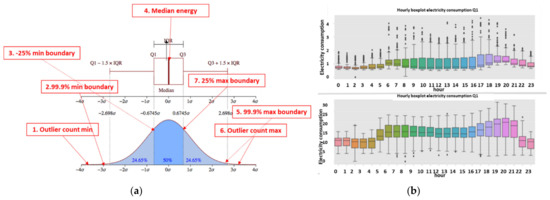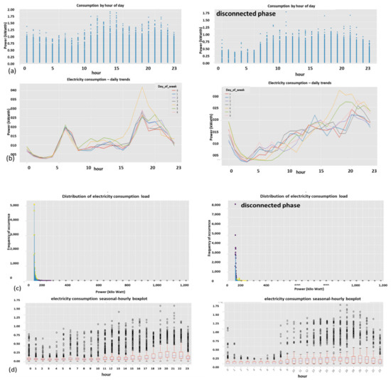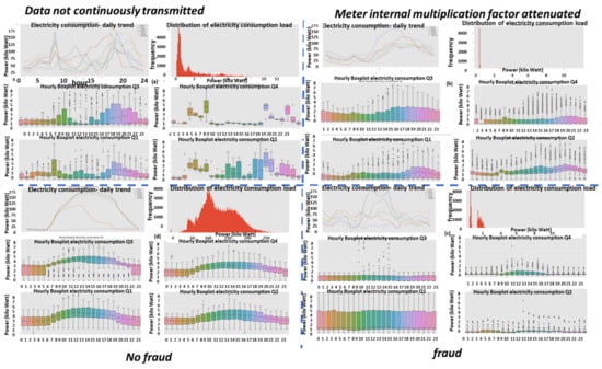 - Finally, in case (3), the daily-hourly trends (3-a) are messier than (4-a, 2-a). The outliers (3-c to 3-f) indicate anomalies and are much more intense than in case (2). The energy consumption (3-b) is larger in the case of fraud than in case (2). The quadrants Q2, Q4, and Q3 boxplots (3-c to 3-f) look similar. The boxplot wave is smooth and not wavy. There is no need to implement all these rules using the software. The classifier and feature space should use them.