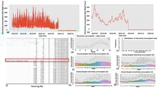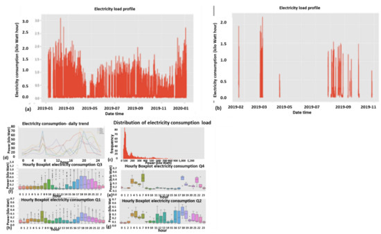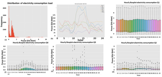 - Observing case (2)—meter internal attenuated due to a firmware bug during the daily time sync by the server network time protocol (SNTP). (ii. 1) The daily-hourly patterns (2-a) are not ordered, but they are the tidiest among all anomalies. Because the consumption pattern is not violated, (ii. 2) the outliers (2-c to 2-f indicate an anomaly, (ii. 3) the energy consumption distribution (2-b) is smaller than the fraud, (ii. 4.) the variance between quadrants Q1–Q4 (2-c to2-f) is much sharper than in the fraud case. There are sub-consumption outliers below the boxplots similar to regular consumption (2-c to 2-f), unique to case (2).