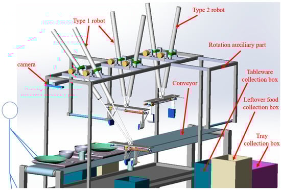 We designed a high-speed tableware cleaning robot system to meet the goal as shown in Figure 1. This system mainly included a camera that detects the type and position of tableware and the presence or absence of leftover food, two types of robots that tidy up the tableware, an auxiliary mechanism that tilts the tableware to throw away the leftover food, a belt conveyor to flow the tray in which the tableware is placed, and some collection boxes for each tableware and tray.