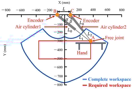 Point A at the tip of the air cylinder is connected by a rotating shaft so that it can rotate. The approximate workspace of the robot arm is set as 800 mm × 200 mm. When the dimensions of the robot arm were determined to satisfy this condition, the stroke of the air cylinder was 500 mm, the initial length was = 270 mm, and the distance between the rotating shafts was L = 180 mm. The blue frame indicates the movable range of the robot. It describes the positions where the strokes of the two air cylinders expand and contract by 20 mm. The red frame is the target range that satisfies the experimental requirements.