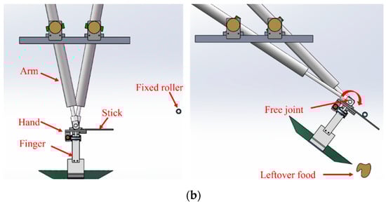 Two-hand design plans for tilting the tableware were built to throw away the leftover food. The fingers opening and closing are similar to the two types of hands. Two fingers are attached to the linear guide and connected to the timing belt so that they can open and close simultaneously. The timing belt is driven by an air cylinder to control the opening and closing of two fingers at the same time. Sponges are attached to the fingers so that the tableware can easily grasped with a larger frictional force []. The main difference is the design of the parts to throw away leftover food, illustrated in Figure 3. In type 1, a rotation axis in the direction of the air cylinder is provided in the middle of the finger so that half of the fingertip can rotate. A stick is attached to the rotating part, hooked on a roller fixed to the frame, and the arm raised the hand to rotate it. In addition, a spring is attached to the rotating fingertip to return it to its original position. In type 2, the T-shaped bearing is rotated 90 degrees and connected to the arm. Two rods are attached to the board of the hand, and by hitting the fixed roller, the tableware grabbed by the hands is tilted, and the leftover food is thrown away. The designed mechanism that rotates the tableware without using a motor could reduce the weight and cost of the hand [].