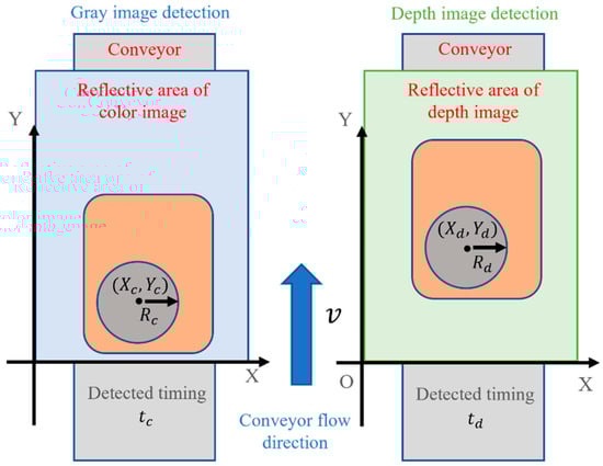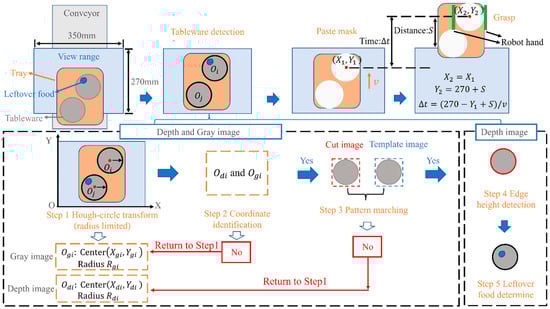 As shown in Figure 4, the image processing begins when the tableware placed on the tray flows into the range of the camera by conveyor. Both the gray and depth images determine the position of the tableware. First, the position and radius of the tableware are detected with the Hough circle transform [,,,,,,], which enables to check whether the coordinates detected in the gray image and the depth image are the same, aiming to prevent erroneous detection. If they are detected not the same, the process returns to the Hough circle transform in step 1 and performs the detection process again in the next position of the tableware by the moving of the conveyor; otherwise, it moves on to the next step. The detected tableware image is pattern-matched with the model image prepared in advance to improve accuracy further. If it does not pass, it returns to step 1 and performs the detection process again. If it passes, it is recognized that the detected position is correct. Then, the depth image determines the height of the tableware and the leftover food. Since the same tableware is not detected twice, a mask is attached to the position of the tableware and the mask is maintained until it comes out of the camera image at the speed v of the tableware. The distance from the end of view range to the robot is S, and the time from the tableware detected to arrive at the robot’s hand is . The robot’s hand closes and grabs the tableware when it arrives. Each part of the image processing are introduced in detail in Section 3.2 and Section 3.3.