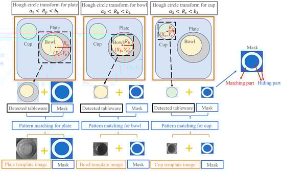Although this study aimed to detect overlapping tableware, the Hough circle transform cannot detect all tableware very well when the tableware overlaps [], and the tableware that is not detected cannot be processed by the robot. To solve this, a dedicated detection for certain tableware was developed, as shown in Figure 5. Each image limits the radius, which guarantees that only specific tableware can be detected. Thus, even if the tableware overlaps, it can be detected. After tableware detection, the part of the tableware surrounded by the red dotted line, as shown in the figure, is removed, and pattern- matching with the model image was performed. If the degree of similarity is less than or equal to the threshold value, it is regarded as an erroneous test and excluded. It is recognized as the correct tableware position if it is beyond the threshold value. Then, a mask is attached to the detected position.