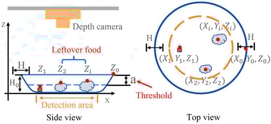 An experiment was conducted to verify the leftover food detection method. The oil clay was used as leftover food that, with height , was put on a plate with height , and the plate was passed into the range of the camera on a conveyor. The threshold value of the leftover food assessment was 15 mm.