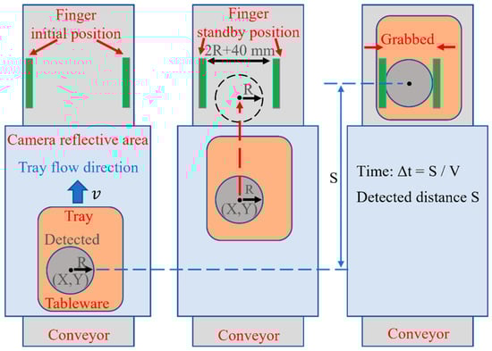 After pasting the mask, the tableware is passed to the robot hand. The position information and diameter information of the tableware are provided by the camera. The robot hand keeps the distance between the fingers 40 mm larger than the diameter of the tableware and moves to the standby position to wait. The time for the tableware is calculated with distance S from the detected position to the grabbed position and the speed V of the conveyor belt. The robot closes the hand according to time and grabs the tableware, as shown in Figure 8.